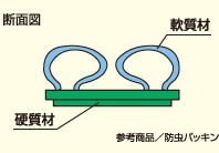 硬質材の樹脂から軟質材の樹脂を付け出すように共押出しすることで、軟質材は緩衝材の役目を果たします。